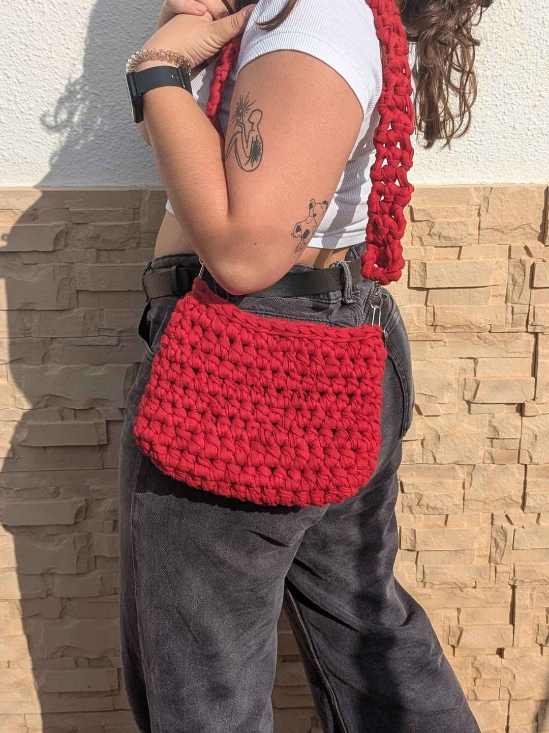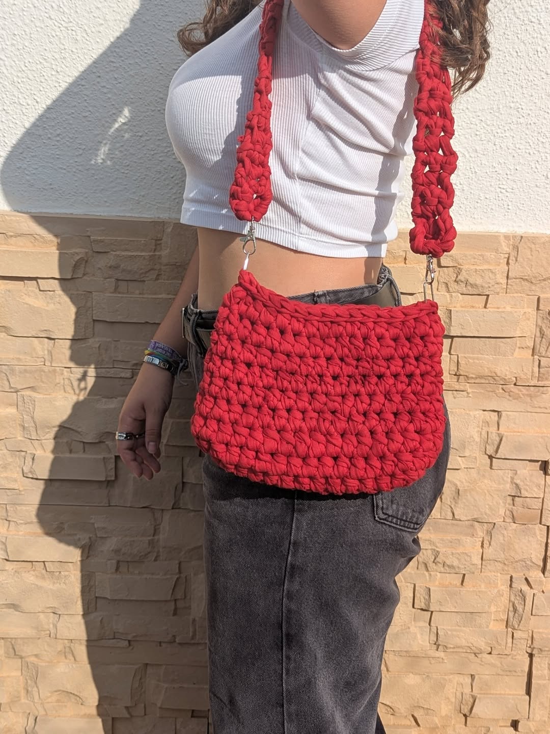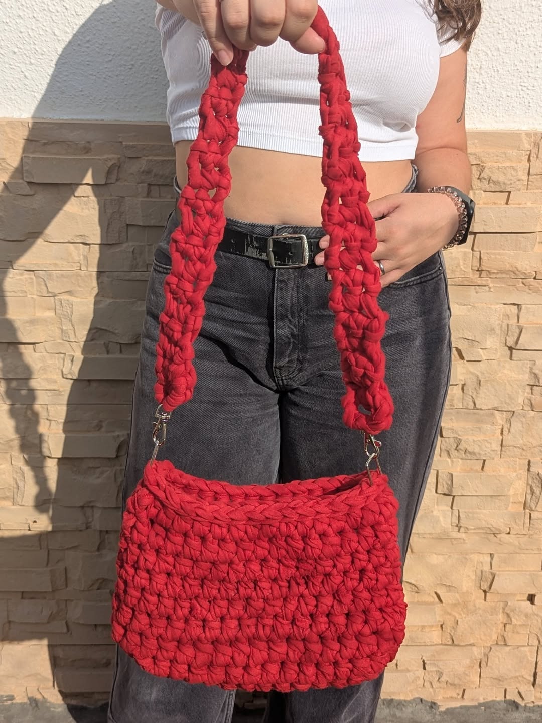 Este bolso rojo está tejido a mano con hilo grueso, lo que le aporta resistencia, originalidad y un encanto artesanal inigualable. Su diseño práctico y versátil lo convierte en el accesorio perfecto tanto para el día a día como para ocasiones especiales. Hecho con dedicación y detalle, es ideal como regalo especial o como complemento para realzar tu look con personalidad.
